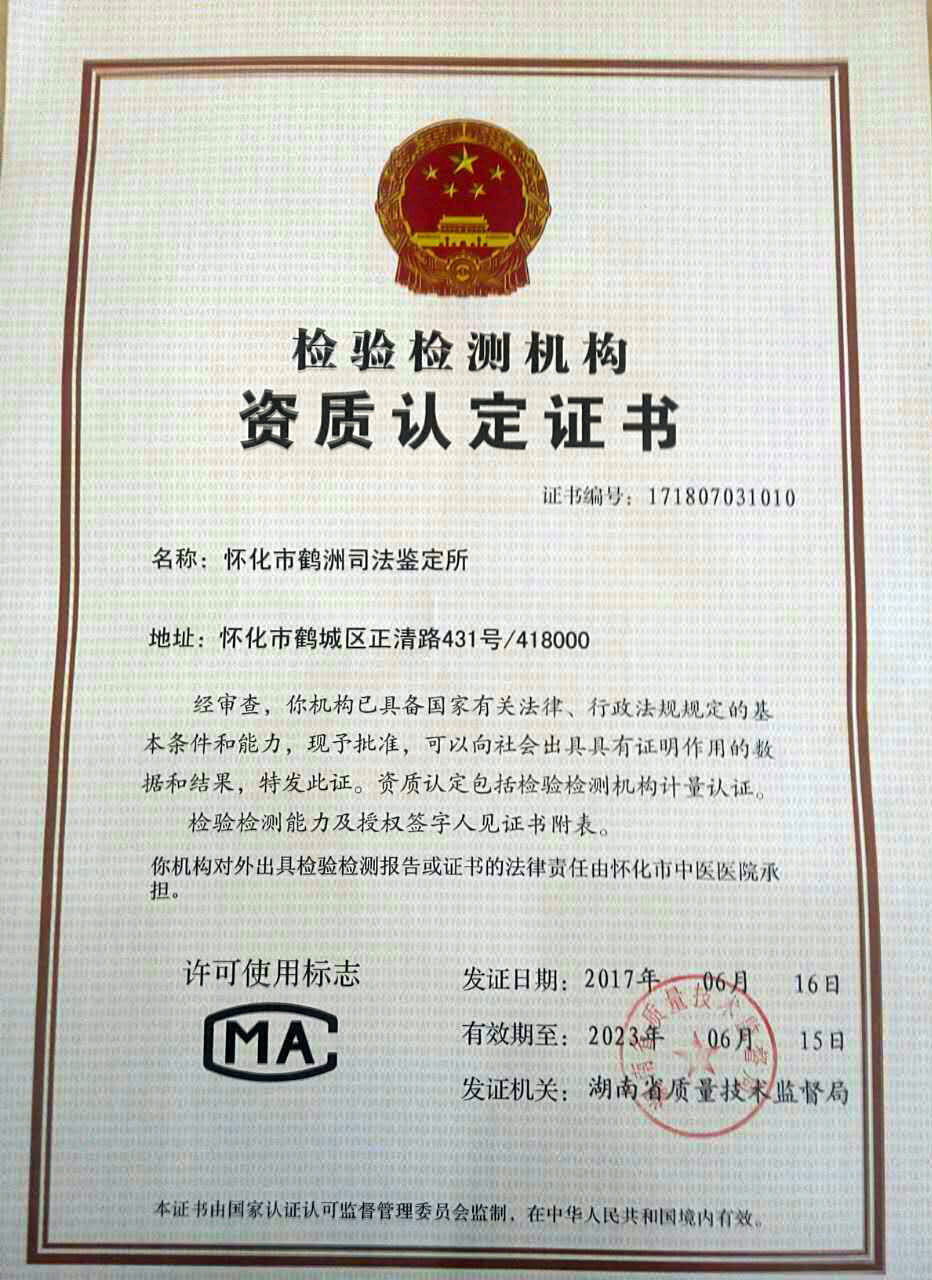 湖南省质量技术监督局在资质认定评估中,对怀化市鹤洲司法鉴定所的工作给予了高度评价,该所已具备国家有关法律、行政法规规定的基本条件和能力,可以向社会出具具有证明作用的数据和结果。并于2017年6月16日向怀化市鹤洲司法鉴定所颁发了检验检测机构资质认定证书。以后鹤洲司法鉴定所出具的鉴定书将加盖“CMA”章,表明其资质和能力符合法定,全国有效。(鹤洲司法鉴定所)